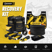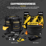Includes kinetic recovery rope, soft shackles, protective sleeves, hitch receiver, recovery ring, winch dampener, gloves and a tough carry bag.
