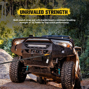Inside the kit you’ll find a kinetic recovery rope with a huge 15,422kg minimum breaking strength and 30% stretch, giving you safer, smoother snatches in tough conditions. Two soft shackles replace heavy steel gear and are reinforced with protective sleeves to handle abrasion, heat and UV exposure. A heavy-duty shackle hitch receiver rated to 4.75T gives you a reliable tow point, while the recovery ring (30,000kg breaking strength) helps keep loads even and consistent.