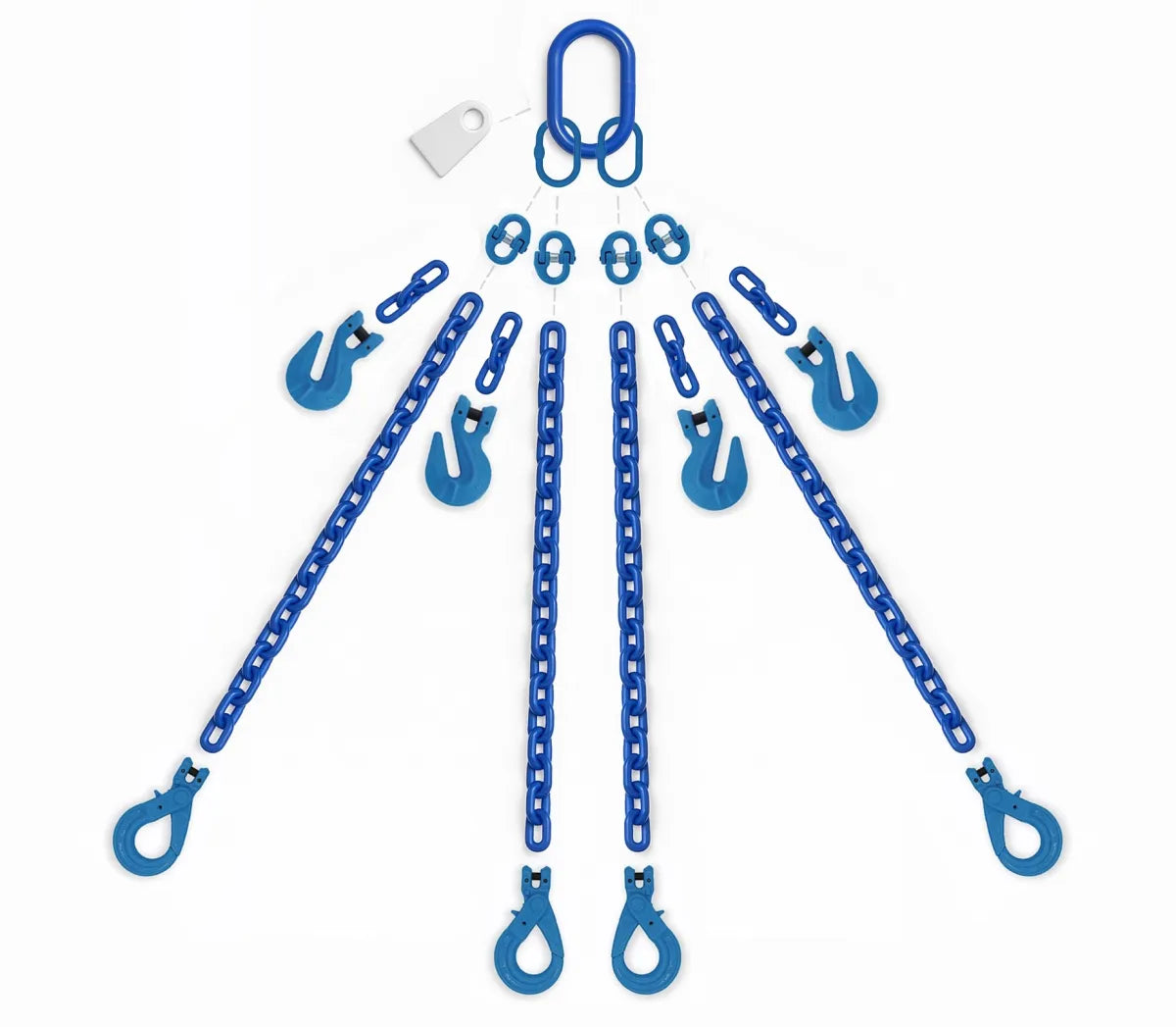 • Four chain legs in Grade 100 alloy chain (available in 8 mm, 10 mm, 13 mm, or 16 mm).